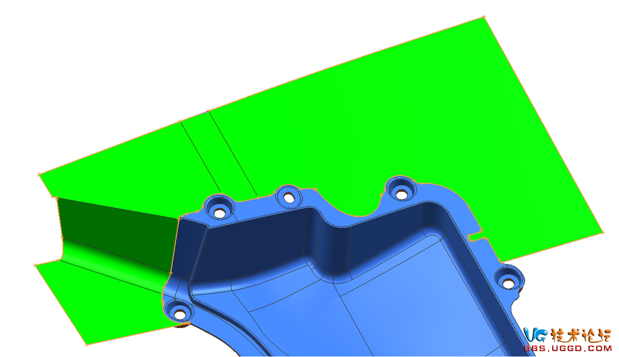 1.分型面優先選擇產品的原始分型面,先用“擴大面”命令將產品的原始分型面擴大,注意擴大的模式選擇線性,擴大兩個面使兩個面相交,結果如圖所示