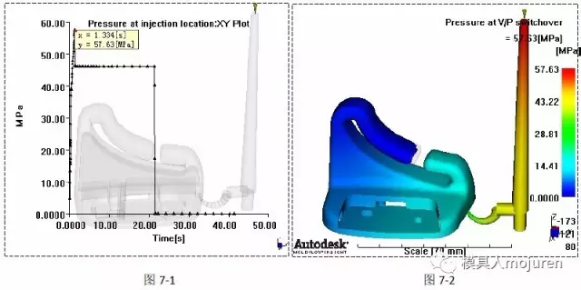 在制品填充的過程中壓力最好不要太大,較大的壓力會使壓力很難均勻的傳遞到產品的各區域,很有可能造成薄壁區域的快速冷卻,繼而阻止后繼壓力的傳遞,形成蝴蝶效應。這種不良的效應破壞性相當大,會造成產品很多方面的缺陷。此產品噴嘴處的壓力及轉換時的壓力,如下圖7-1、7-2所示